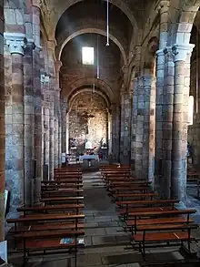 El templo es un edificio románico del siglo XII, de planta basilical, de tres naves y tres ábsides en las cabeceras. Las naves están separadas por pilares fasciculados, compuestos de pilastras y semicolumnas sobre las que apoyan los arcos de medio punto, que separan las naves, y los arcos transversales, que sostienen la cubierta de madera. Los capiteles adornados con motivos vegetales. Los arcos de la nave central, más ancha que las laterales, y de cinco tramos, son de medio punto; los arcos de las naves laterales son apuntados.