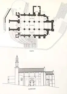 El muro lateral norte está compuesto de cinco contrafuertes unidos en arco. El muro de la parte sur está dividido por tres pilares y dos grandes contrafuertes, recurrido por un alero a mediana altura, debido al monasterio arrimado. En este muro está la puerta descubierta en 1976, adornada con cuatro columnas decoradas con motivos geométricos y flores de lis nos sus fustes y rematadas en capiteles. Tres arcos a modo de arquivoltas, adornados con diversos motivos, completan el trazado arquitectónico de esta puerta.
