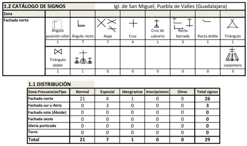 Se han identificado un total de 27 marcas de cantero situadas en el exterior del templo -fachada norte- y 3 de carpintero en el Atrio: