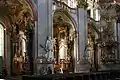 Los nuevos planos incluían un intrincado sistema geométrico de cilindros interconectados con una cúpula central sobre el crucero. La masiva nave con capillas laterales y una bóveda ondulada basada en un sistema de elipsoides que se cruzan fue aparentemente construida por Christoph Dientzenhofer.[3] Los pilares entre los amplios vanos de la arcada que sostienen el triforio estaban destinados a maximizar el efecto dinámico de la iglesia. El coro y su característica cúpula de cobre se construyeron entre 1737 y 1752, esta vez con planos del hijo de Christoph, Kilian Ignaz Dientzenhofer.