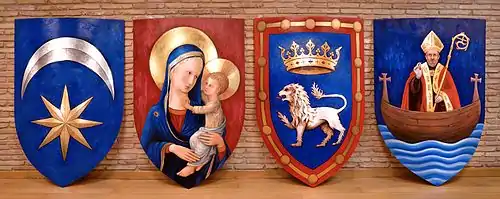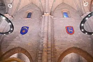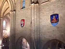 En el año 2013 fueron colocados 4 escudos en los muros altos de la nave principal, que representan a los antiguos burgos de la Navarrería, San Nicolás y San Cernin, así como el escudo de la ciudad de Pamplona. Fueron policromados por el pintor y restaurador navarro Jorge Urdánoz Apezteguía mediante la técnica del óleo, con aplicaciones de pan de oro y pan de plata sobre tabla. Sus dimensiones son de 1,8 metros de alto por 1,5 metros de ancho cada uno. El diseño fue consensuado entre el autor, y el historiador Juan José Martinena Ruiz. Se bendijeron en la misa del día 8 de diciembre de ese mismo año.