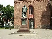 A las afueras del principal acceso a la iglesia y frente a la torre del campanario, se encuentra una estatua en homenaje al príncipe elector del margraviato de Brandenburgo, Joaquín II, obra hecha por el escultor alemán Erdmann Encke. Frente a la iglesia se encuentra su museo parroquial y café, llamado Spandovia Sacra, que almacena piezas históricas del templo, entre las que destaca una biblioteca con más de 3 mil tomos, cuyo manuscrito más antiguo data del año 1447, que además cumple funciones de archivo para fines eclesiásticos.[2]