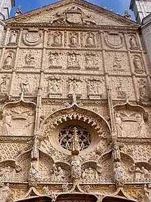 La fachada, responde parcialmente al estilo gótico isabelino,[12] como se ha mencionado, se sabe que las obras dirigidas por Simón de Colonia se concluyeron hacia 1500, pero en la fachada se distinguen dos partes claramente diferenciadas: