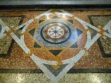 Joan Torras fue uno de los maestros de Gaudí durante su formación, motivo por el que probablemente recibió el encargo de completar la decoración de la iglesia.[6] Gaudí realizó diversas intervenciones en la iglesia y el colegio: en la primera diseñó el altar, la custodia, el mosaico del pavimento y la iluminación; en el colegio fue artífice del mobiliario. La mayoría de estas obras se perdieron en un incendio provocado en el transcurso de la Semana Trágica en 1909, del que solo subsistió el mosaico; también se conservan las abrazaderas de los aparatos de iluminación, que habían sido anteriormente trasladadas por las monjas a otro colegio. Del altar se sabe que era de estilo gótico y la custodia de estilo bizantino, pero no se tienen más detalles. El mosaico es una obra de opus tessellatum, realizada probablemente por el mosaiquista italiano Luigi Pellerin, autor del mosaico del vestíbulo de la iglesia de las Salesas, obra de Joan Martorell —otro de los maestros de Gaudí— en la que intervino Gaudí como ayudante. El mosaico está formado por pequeñas piezas de mármol, unidas por mortero de cal. En la nave y el presbiterio tiene motivos geométricos, mientras que en el crucero figuran diversas letras: J y M, por Jesús y María; y Α y Ω (alfa y omega), la primera y última letras del alfabeto griego, que en el ámbito cristiano se corresponden a la simbología del principio y el fin, identificados con Jesucristo o Dios. Este pavimento fue restaurado en 1986 por Lluís Bru, cuya intervención fue inaugurada en 1989 por el cardenal Narcís Jubany.[7]