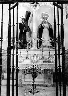 En la pared hay una lápida conmemorativa que recuerda la fundación en la parroquia de la Obra Pía de los Sagrarios-Calvarios por el arcipreste de la ciudad, San Manuel González García, el 4 de marzo de 1910.