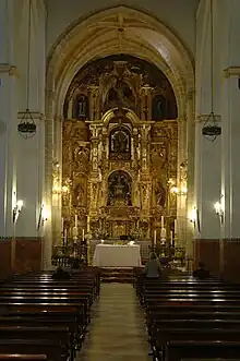 El retablo mayor es una obra barroca de madera dorada y policromada realizada por Antonio José de Carvajal en 1722. En 1758 fue restaurado y dorado por José Fernández del Hierro, gracias a la intervención del vicario eclesiástico Antonio Jacobo del Barco. La última restauración fue realizada en 2004 por Juan Aguilar. Es una obra de gran formato compuesta por tres cuerpos y tres calles delimitadas por estípites, la central más ancha que las laterales. Su decoración consta principalmente de querubines, guirnaldas de flores y frutos, veneras, rombos y capiteles compuestos.