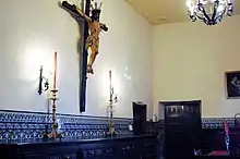 Los muros se adornan con altos zócalos de cerámica. Los paños del lado del Evangelio son del siglo XVI, mientras que los del lado de la epístola se adornan con azulejos modernos colocados al cegarse en 1925 la puerta que comunicaba con la antigua sacristía.