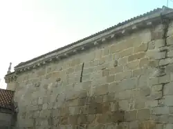 La cornisa, de gran anchura y conformada por secciones de longitud regular y moldurada en una nacela y un listel, luce en algunas áreas una franja en la zona inferior, aspecto que revela que este ornamento ha sido sujeto de una o varias reformas, disponiéndose bajo la misma una serie de veintiún canecillos a intervalos regulares y con forma de nacela simple. En el tramo exacto donde la pared meridional de la nave se superpone con la cabecera se aprecia un refuerzo a manera de estribo de escaso desarrollo el cual llega hasta la mitad de la altura de la pared, mientras que como remate del piñón del testero se ubica un carnero en representación del Agnus Dei (característica muy frecuente en los templos gallegos) cuya cruz antefija se fecha en una época muy posterior. Por otro lado la cabecera, de planta rectangular, ha experimentado varias reformas ya que en su fachada meridional se abrió una ventana rectangular de gran tamaño con la altura considerablemente aumentada con respecto a la original, además de emplazarse seis hiladas nuevas, si bien la variación más notoria consiste en haberse elevado su cara oriental, coronada inicialmente por un hastial apiñonado y en la actualidad cerrada como un cubo sobre las demás caras, si bien algunos canecillos ubicados bajo la cornisa en las zonas meridional y septentrional son originales y fueron reutilizados. Esta cara, al igual que la meridional, presenta un filete seguido de una nacela, con todas las secciones mostrando una franja dividiendo ambos elementos; esta cara se halla sostenida por siete canecillos de idéntica forma aunque diversas dimensiones: sobre el espacio de dos superficies superpuestas a manera de cartelas se ubica una nacela doble con los extremos inferior y superior decorados con formas triangulares cuyos vértices se acercan siguiendo el borde que divide las dos nacelas, en las que los lados se curvan a imagen y semejanza de la forma de estas. Otros dos canecillos fueron incorporados respectivamente en los ángulos sureste y noreste siguiendo fielmente la estructura de los demás emplazados en la cabecera.[1]:320
