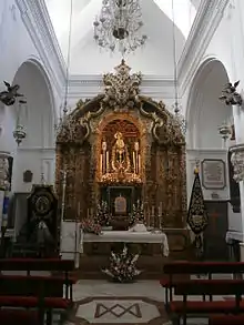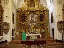 El retablo también es rococó y se puede atribuir a Francisco Javier Pedraxas, que era miembro de a cofradía titular. Entre otros retablos, y bajo dosel, se encuentra un Crucificado, Cristo del Descendimiento, fechado en 1629 y del escultor sevillano Juan Fernández de Lara escoltado por Santa María Magdalena y San Juan Evangelista.[9]