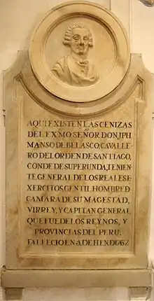 Aquí existen las cenizas de Exmo. Señor, Don Jph. Manso de Belasco, Cavallero del Orden de Santiago, Conde de Superunda, Teniente General de los Reales Exércitos, Gentil Hombre de Cámara de su Magestad, Virrey, y Capitán General, que fue de los Reynos y provincias de Perú. Falleció en 5 de hen. de 1767.