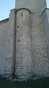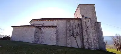 En el exterior, en la parte superior de la fachada, hay muros exteriores y canecillos blandas debajo de los aleros del techo.