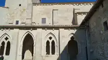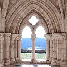 Pero lo realmente significativo y destacable es el pórtico gótico adosado a la fachada y «orientado al mediodía»[3] donde se muestran arcos apuntados entre los contrafuertes. Uno de ellos sirve de acceso, mientras que las dos adyacentes mantienen sendas ventanas geminadas cuyo parteluz está coronado por una roseta de cuatro lóbulos.