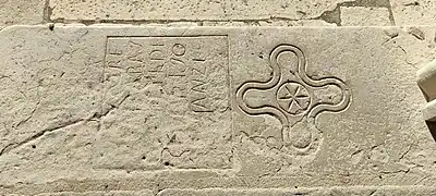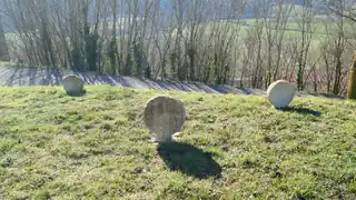 Dentro del conjunto, a pocos metros de distancia de la cara norte de la torre, se identifican tres estelas discoidales decoradas por ambas caras respectivamente.
