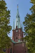 Está rodeada por modernos edificios y frente al centro comercial Ciudad de Ahléns. El convento y la iglesia de Santa Clara fueron fundadas en 1280. En 1527 bajo el mandato de Gustav Vasa la iglesia y el convento fueron demolidos y la construcción de la iglesia actual comenzó en 1572 bajo el mandato de Juan III de Suecia.[1] Su torre es original de 1880, tiene una altura de más de 115 metros y ejerce de brújula en esta área ya que es visible desde muchos puntos.[2][3]