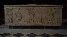 Este sarcófago, hallado en 1885, mide 2,17 m de largo por 0,60 m de ancho y 0,64 m de altura, faltándole la piedra de cubierta. Fue encontrado vacío a 5 o 6 metros de profundidad al hacerse la excavación para los cimientos de una capilla adosada al muro norte de la iglesia. Solamente presenta decorada la cara anterior en la que aparecen tres escenas del Antiguo y del Nuevo Testamento que simbólicamente hacen referencia a Jesucristo.[1]