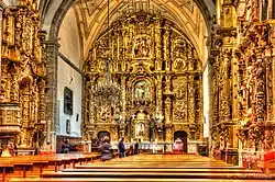 Hay un gran contraste entre la sobriedad exterior y el barroco interior, con ricos retablos, destacando el retablo mayor de 1739, con la imagen del Cristo del Socorro. Está dividido en tres calles y ático semicircular, las calles laterales son escenas de la vida de María. Está basado en el retablo Nuestra Señora del Rey Casto de la Catedral de Oviedo.[5] Del resto de los retablos se perdió su imaginería original.
