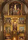 " Consta de banco, dos cuerpos y ático. Es un retablo pensado par exhibir pintura, pues lleva seis grandes lienzos. En el banco se dispone de forma apaisada el lavatorio de los pies por Cristo y la Sagrada Cena. En el primer cuerpo figuran la vocación de San Pedro y las lágrimas del apóstol tras la negación de Cristo. En el segundo cuerpo van la liberación de San Pedro por un ángel y su crucifixión. Han sido eliminados de la arquitectura las hornacinas para alojamiento de las esculturas, de suerte que se sitúan en el frente de las pilastras que separan los lienzos, tapando una parte de estos. En el cuerpo primero se hallan los evangelistas; en el segundo los Doctores Máximos. Una hornacina central, que abarca los dos cuerpos, aloja el santo titular. A los lados se sitúa un adorno de frutas, en forma de subiente, que tiene arranque en dos niños situados en el ático. En éste destaca una gran portada, en que tienen amplio acomodo las esculturas de Cristo crucificado, la Virgen y San Juan. "J. J. Martín González, escritor, 1986