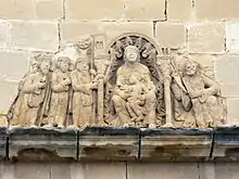 Sobre la entrada del atrio, se encajó una epifanía, probablemente procedente del tímpano de la derruida portada románica del muro de poniente, colocada directamente sobre la puerta.