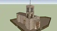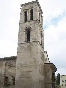 En el lado norte de la iglesia y a la izquierda de la puerta principal, se encuentra la torre románica exenta menos por un lado del cuerpo de la iglesia, no muy alta, y con tres cuerpos de planta cuadrada.