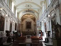El interior es de nave única rectangular, con bóveda de cañón y presbiterio de forma cuadrada rematado por una cúpula. La arquitectura de la bóveda, de líneas esenciales y sencillas de estilo gótico tardío napolitano, está cubierta con decoraciones que se remontan a las renovaciones del siglo XIX. El pavimento con mayólicas se remonta a los siglos XVII-XVIII, mientras que la cúpula, remodelada durante las restauraciones del siglo XVII, presenta un lucernario en el centro y decoraciones del siglo XIX en los gajos, mientras que en los peducci (capiteles colgantes) aún son visibles las figuras de cuatro profetas que se remontan a las obras de restauración del siglo XVII.