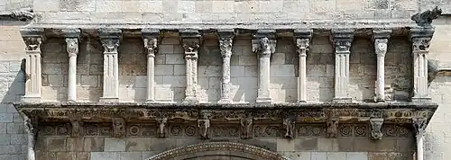 La galería falsa está soportada por ménsulas típicamente románicas, adornadas con águilas y cabezas de asnos y de carneros. En sus extremos, está sostenido por dos elegantes columnillas soportadas por cabezas de bovino.