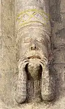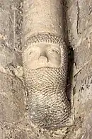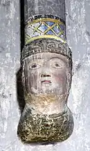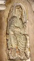 En el porche se pueden observar dos relieves procedentes de la antigua fachada románica. Uno de estos relieves representa el Cristo en Majestad. El otro muestra una mujer sentada que podría representar a santa Radegunda o la Virgen o una personificación de la Iglesia. Lleva una corona y un velo, además de un vestido que presenta pliegues. Se inclina hacia la izquierda. Se podría decir que estos relieves son los vestigios de una antigua escultura en la que estaban juntos, aunque sólo es una suposición; así pues, la santa tenía que encontrarse ubicada a la derecha del Cristo. Aún se pueden observar restos de pintura.