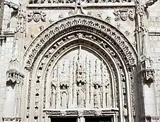 El pórtico de estilo gótico flamígero data del siglo XV, así como el patio delantero, donde se encuentran bancos de piedra que servían en juicios eclesiásticos.