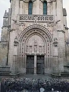 Las estatuas del tímpano son del siglo XIX y representan a Santa Radegunda y San Hilario.