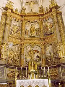 Destacan en él las figuras en altorrelieve y casi exentas de los fondos pintados a modo de escenario. Dispuesto en tres calles verticales mediante columnas, muestra seis grandes espacios en los dos cuerpos superiores, quedando presidido en la calle central por una imagen de la Virgen con el Niño rodeados de ángeles en el cuadro superior y por el titular del templo, Santiago, que aparece a caballo guiando a los soldados cristianos en la lucha contra el infiel.