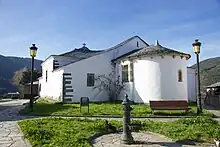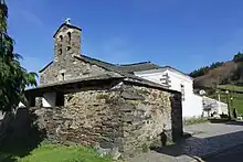 La planta de la iglesia se asemeja a una cruz griega en el interior y el exterior presenta una forma cuadrangular. Sus muros están fabricados en mampostería de pizarra con refuerzo en las esquinas y vanos con sillares.