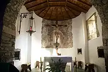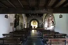 En el templo contiene diferentes tallas, una pila bautismal, retablos del siglo XVIII, y pinturas murales del siglo XV