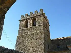 La base del campanario de la iglesia presenta una estructura que podría encajar dentro de este contexto como un sistema defensivo formado por una torre aislada o pequeño castillo. Se muestra claramente la diferencia de aparejo exento respecto al muro adosado de la iglesia y se aprecian las distintas etapas constructivas, rematada por el campanario y una serie de almenas decorativas construidas en el siglo XV. Destacan las gárgolas de las cuatro esquinas de la torre.