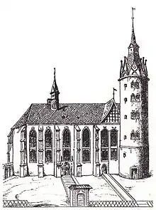 Cuando a finales del siglo XV el príncipe de Wettin Frederick III el Sabio, el elector de Sajonia desde 1486, hizo reconstruir la antigua fortaleza de Ascania, una nueva iglesia de Todos los Santos fue diseñada por el arquitecto Conrad Pflüger[4] (1450-1506 /07) y erigida entre 1490 y 1511[7] en el estilo gótico tardío.[2][5] Consagrada el 17 de enero de 1503, se convirtió en parte de la residencia de Federico o “Residenzschloss”, también llamado Schloss Wittenberg.[7][5] Amplios trabajos de Tilman Riemenschneider, Jacopo de'Barbari y Alberto Durero contribuyeron a la construcción del complejo del palacio y luego la iglesia. Después en 1502 el Elector Federico III fundó la Universidad de Wittenberg (Leucorea) y recibió la confirmación por el legado papal Raymond Peraudi en 1507, Todos los Santos fue incorporada para servir como capilla a la universidad y rápidamente se convirtió en un importante centro académico y de culto. Los estudiantes recibieron sus doctorados allí, y el reformador Philipp Melanchthon hizo su famoso discurso inaugural en la iglesia. Se desarrolló una tradición de enterrar dignatarios académicos de la universidad en la iglesia. Varios epitafios notables se conservan hasta hoy.
