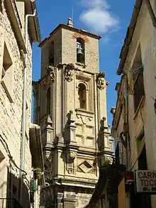 En uno de sus ángulos se levanta la torre, cuyos dos primeros cuerpos datan del siglo XVIII, mientras que el tercero, el cuerpo de campanas, es un añadido posterior. En la distancia, también destaca el gran tambor con linterna que envuelve la cúpula con la que se cubre el crucero.