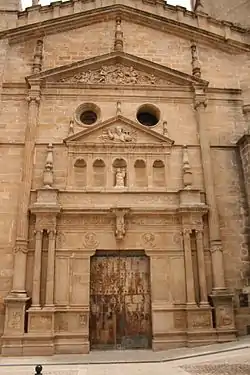 Por otro lado, al exterior destaca la magnífica fachada realizada en estilo manierista conjugando diversos motivos clásicos. Aparece flanqueada por un orden gigante de columnas acanaladas jónicas que soportan un frontón que enmarca otro cuerpo menor de dos pisos. El piso inferior aparece flanqueado por dos pares de columnas que sujetan un entablamento sobre el que se desarrolla el segundo cuerpo, formado por cinco hornacinas rematadas por otro frontón triangular, sobre el que se abren dos óculos.