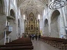 Consta de una amplia y elevada nave única de cuatro tramos con pequeñas capillas entre los contrafuertes, cabecera poligonal y coro alto a los pies. La sobriedad del interior del conjunto, cubierto con diversos tipos de bóvedas de crucería estrellada, sólo se rompe en el coro, dotado de una balaustrada clásica.