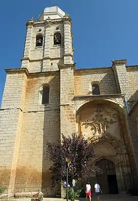 La torre, de gran porte, fue construida a mediados del siglo XVIII por Juan de Sagarvinaga dentro de un estilo neoclásico que toma modelos de Juan de Herrera. Varios altares laterales. Coro barroco de nogal y un excelente órgano de finales del siglo XIX, instalado en la caja del antiguo órgano barroco que construyó Betolaza, siglo XVIII (que también construyó el de El Burgo de Osma-Ciudad de Osma).
