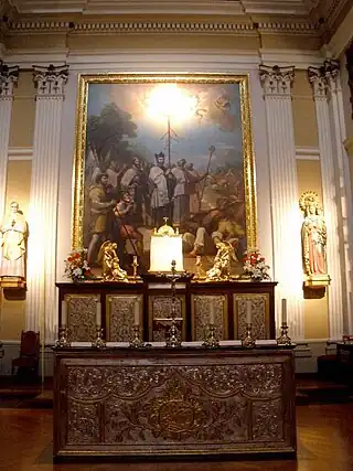 El interior tiene forma de cruz griega inscrita en un cuadrado. La cúpula central, con pechinas pintadas por Braulio González y rematada con una linterna, es uno de los elementos más destacables. Del arte conservado en el interior hay que destacar el cuadro La batalla de las Navas de Tolosa (1785) de Ramón Bayeu y en el retablo de San Gregorio Magno un lienzo de José Luzán. A los lados se encuentran los retablos neoclásicos de San Miguel Arcángel y el Santo Cristo.
