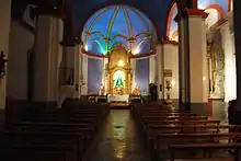 Consta de tres cuerpos enlucidos y está coronada por una veleta de hierro forjado con el símbolo de la soledad con remate de la cruz triunfante. El interior está dividido en tres naves separadas por pilares cruciformes y sostenidos por arcos de medio punto.[2] La capilla, con forma hexagonal, cubre una falsa bóveda de gallones unida en el centro formando un florón.