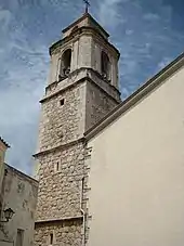 La cabecera de la iglesia está adosada a los restos del recinto amurallado de la villa.