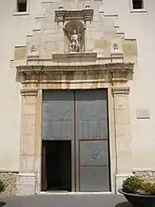 La portada centra una fachada rematada por una cornisa a dos aguas, y tiene adosada junto al Evangelio la torre campanario. Esta portada, con arco de dintel en la apertura, está flanqueada por pilastras con basamento y capitel simples, que soportan un entablamento roto. Por encima, a los extremos, siguiendo las pilastras inferiores, remados circulares, que enmarcan una hornacina en forma de pechina protegida por pilastras y entablamento, con las mismas características que las del cuerpo inferior. Y sobre este entablamento, unos pináculos adosados y en el centro una cruz. Arriba de la portada una ventana sirve para iluminar la nave central.[7]