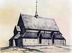 La mayor parte de la madera es original, y el templo conserva bastante bien sus características medievales. Es una iglesia-salón de Tipo A, con un techo elevado de dos aguas y nave y coro de la misma anchura. Un corredor rodea a la iglesia por los cuatro costados, con techo significativamente más bajo que el del resto del templo y muros con pequeñas aberturas alargadas que permiten la ventilación. En el centro del caballete del techo de la nave hay una pequeña torre central, que funciona de campanario.