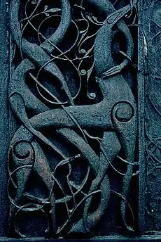 Por otro lado, es posible que la decoración de la iglesia anterior representara una escena de la mitología nórdica, una razón probable para su prematura reconstrucción en el siglo XII. En este contexto, el animal podría interpretarse como el dragón Nidhogg royendo las raíces de Yggdrasil, el árbol de la vida. «Las serpientes entrelazadas y los dragones representan el fin del mundo según la leyenda nórdica del Ragnarök».[5]