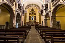 Una vez en su interior, y a ambos lados de la entrada, se encuentran las capillas del Pilar y de la Purísima Sangre. Las pequeñas capillas del lado del evangelio tienen retablos dedicados a San Antonio de Padua, la Inmaculada Concepción y los santos Cosme y Damián.
