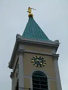El campanario mide 61,70 metros de altura, y una escalera de 150 peldaños conduce a su planta superior. El Ángel de la Paz que corona la torre mide 2,70 m de altura y cambiar de forma y dirección según sopla el viento, mostrando su procedencia.