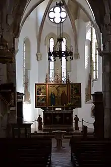 El retablo tríptico, el más antiguo de la provincia, data de alrededor de 1450; el panel principal está unido a los paneles laterales pintados en ambas caras, en dos niveles. La pieza entera representa escenas de la Pasión de Cristo. La crucifixión es el tema central,[1] cuatro veces el tamaño de los otros paneles, más de la mitad de este panel es dorado. Los paneles laterales delanteros muestran el lavatorio de los pies, la última cena, la flagelación y el juicio de Caifás; la parte trasera tiene a las mujeres que lloran, el entierro, la resurrección y los portadores de mirtos. Las figuras son simples y reducidas a sus elementos esenciales, sus movimientos restringidos o incluso escultóricos, su ropa sin arrugas. Los fondos son superficiales, con los interiores mostrando solo una ligera atención a la perspectiva geométrica. Los colores son vívidos, y los rojos tienen un brillo particular por el fondo dorado.[4] El artista es desconocido, pero probablemente se formó en la escuela vienesa.[1] En 1461 se añadió un campanario sobre el centro de la iglesia. La forma de la cruz griega se modificó entre 1512 y 1515: se agregaron dos naves laterales de tamaño desigual, mientras que la principal se amplió. El interior es simple y no tiene rastros de frescos, mientras que las pinturas del siglo XIX se eliminaron durante la restauración.[5]
