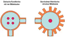 Las iglesias redondas más conocidas de Dinamarca (en danés: rundkirke) se encuentran en la isla de Bornholm. Fueron construidos en el siglo XII, pero se desconocen las fechas exactas.[9] Se han modificado repetidamente. Su importancia radica en sus muros exteriores a modo de fortaleza con grandes contrafuertes, que soportan el peso de una bóveda de cañón redondo junto con un pilar central.[10] Todas las iglesias redondas de Bornholm, excepto Ny Kirke, son iglesias fortificadas.[11] El pilar central suele estar decorado con un friso pintado. Originalmente, las iglesias redondas tenían techos planos con crestería (para la defensa). Sus característicos tejados cónicos se añadieron por primera vez a finales de la Edad Media. El peso de estos techos descansa sobre las paredes exteriores, lo que hace necesarios unos fuertes soportes externos, que son especialmente distintivos en la Iglesia de Østerlars. Las primeras tres iglesias de la lista que figura a continuación tienen tres pisos, aunque la Ny Kirke tiene dos pisos. Los pisos superiores solo son accesibles por pasajes estrechos y sirvieron a la población local como refugio contra las incursiones piratas.[9][12]