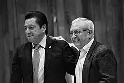 ![]() Ignacio Clapés Patlán (costado derecho) junto a Francisco Araiza durante su conferencia magistral en la Facultad de Música, agosto de 2019. | ||