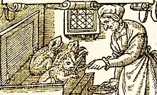 Antiguo grabado en madera mostrando una bruja alimentando a sus diablillos domésticos o Imps.