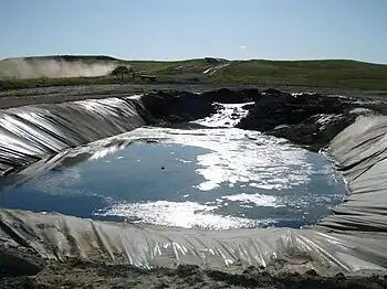Los productos químicos volátiles que se encuentran en los estanques de evaporación de aguas residuales pueden evaporarse a la atmósfera o desbordarse. La escorrentía también puede terminar en sistemas de aguas subterráneas. El agua subterránea puede contaminarse con camiones que transportan productos químicos de fracturamiento hidráulico y aguas residuales si están involucrados en accidentes en el camino a sitios de fracturamiento hidráulico o destinos de eliminación.[61]